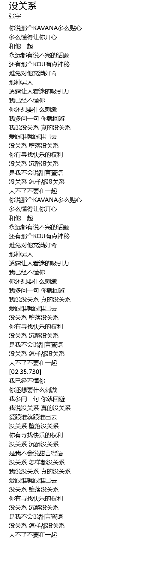 | [02:28.650] | méi guān xì zěn yàng dōu méi guān xì |