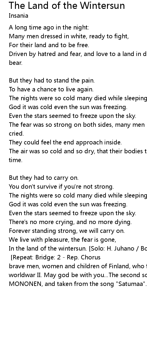 In the land of the wintersun. [Solo: H. Juhano / Both / N. Dahlin / P. Vastila / Both & Vastila] [Repeat: Bridge: 2 - Rep. Chorus] [This song is dedicated to the brave men, women and children of Finland, who fought against Russia during worldwar II. May god be with you...The second solopart is written by UNTO MONONEN, and taken from the song "Satumaa".] |