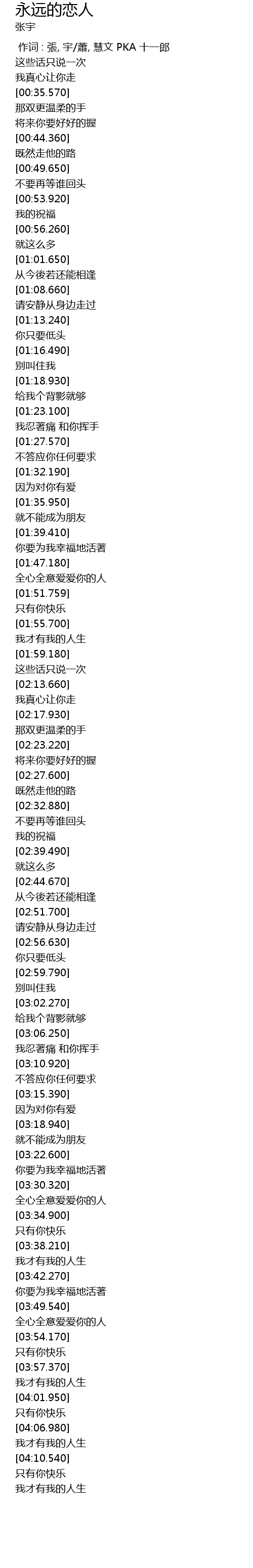 | [00:00.00] | 作词 : 張, 宇/蕭, 慧文 PKA 十一郎 |