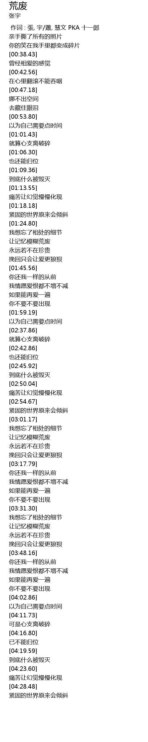 | [00:00.00] | 作词 : 張, 宇/蕭, 慧文 PKA 十一郎 |