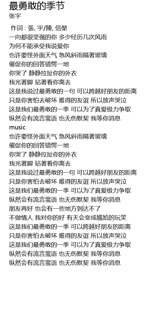 | [00:00.00] | 作词 : 張, 宇/陳, 信榮 |