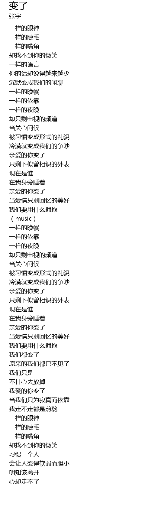 | [01:34.09] | qīn ài de nǐ biàn le |