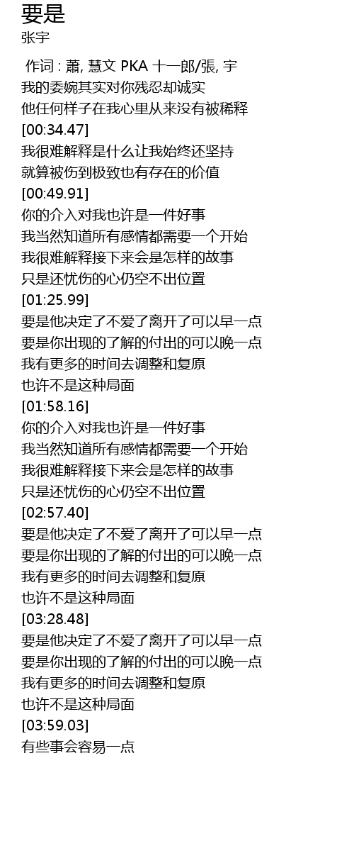| [03:00.93] | 要是他决定了不爱了离开了可以早一点 |