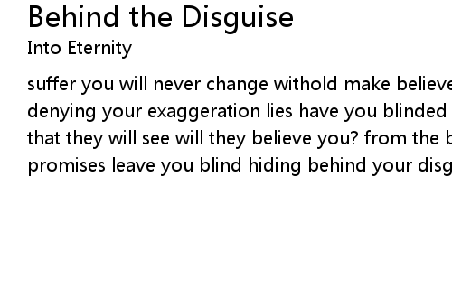 | suffer you will never change withold make believe fake false stories no point denying your exaggeration lies have you blinded half truths decieved you hoping that they will see will they believe you? from the back of your mind fake promises leave you blind hiding behind your disguise |