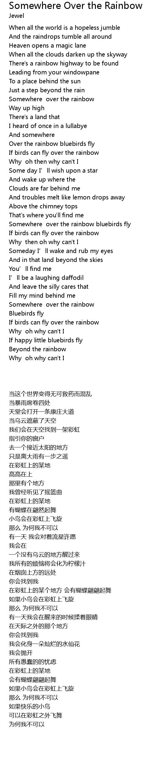 | [01:35.13] | Over the rainbow bluebirds fly |