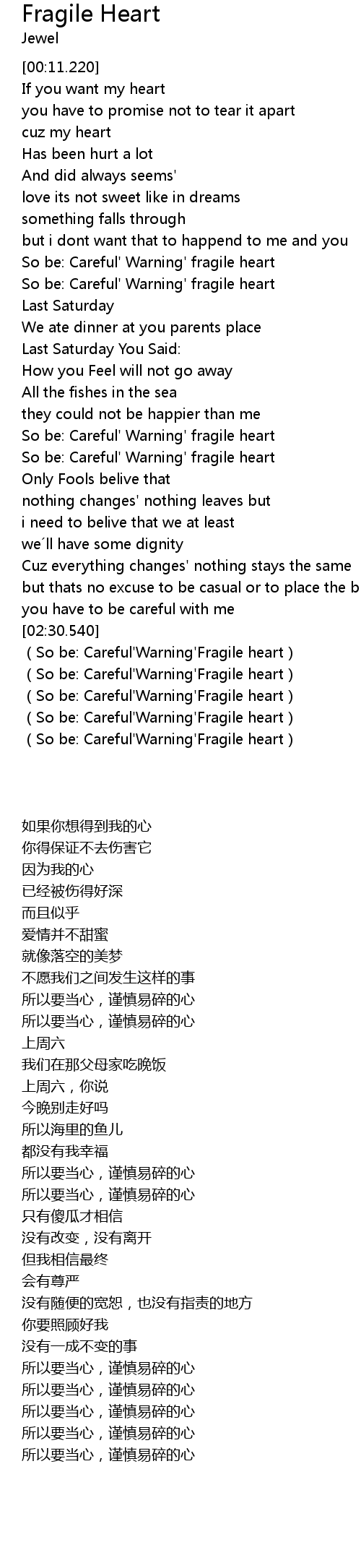 | [02:49.160] | So be: Careful' Warning' Fragile heart |