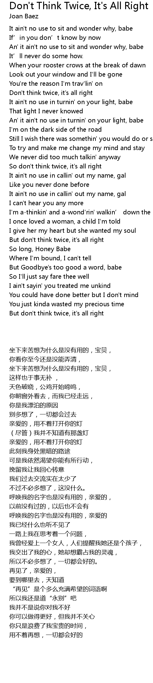 | [02:10.18] | But don' t think twice, it' s all right |