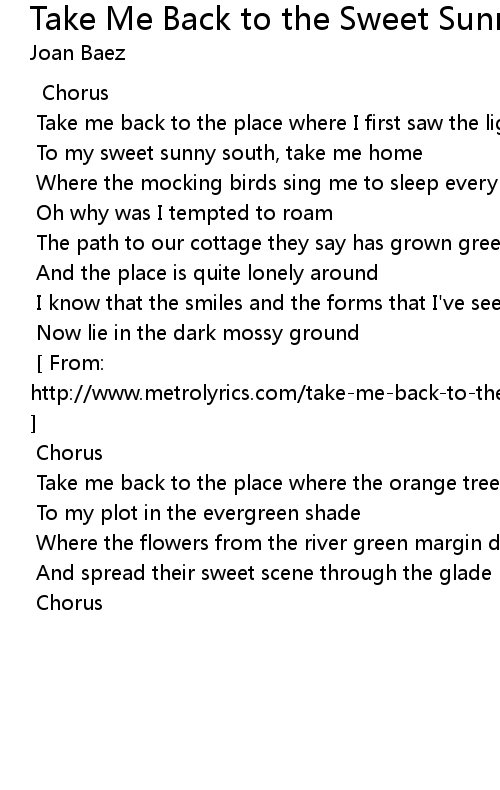 [ From: http://www.metrolyrics.com/take-me-back-to-the-sweet-sunny-south-lyrics-joan-baez.html ] |