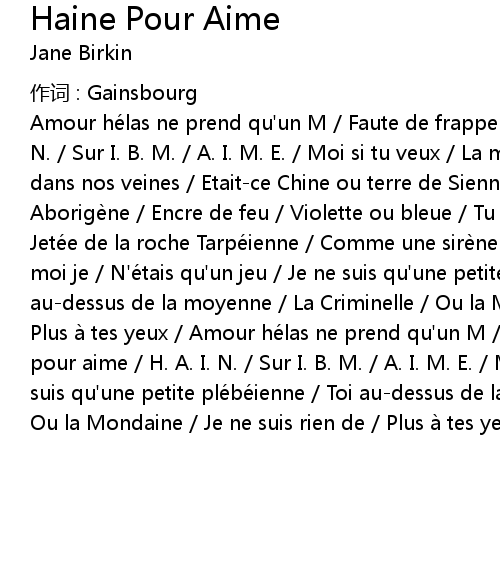 | Amour he las ne prend qu' un M Faute de frappe c' est haine pour aime H. A. I. N. Sur I. B. M. A. I. M. E. Moi si tu veux La m me chose encre coulait dans nos veines Etaitce Chine ou terre de Sienne Noire indige ne Aborige ne Encre de feu Violette ou bleue Tu m' as balance e aux mure nes Jete e de la roche Tarpe ienne Comme une sire ne De polystyre ne Pour toi moi je N'e tais qu' un jeu Je ne suis qu' une petite ple be ienne Toi audessus de la moyenne La Criminelle Ou la Mondaine Je ne suis rien de Plus a tes yeux Amour he las ne prend qu' un M Faute de frappe c' est haine pour aime H. A. I. N. Sur I. B. M. A. I. M. E. Moi si tu veux Je ne suis qu' une petite ple be ienne Toi audessus de la moyenne La Criminelle Ou la Mondaine Je ne suis rien de Plus a tes yeux |