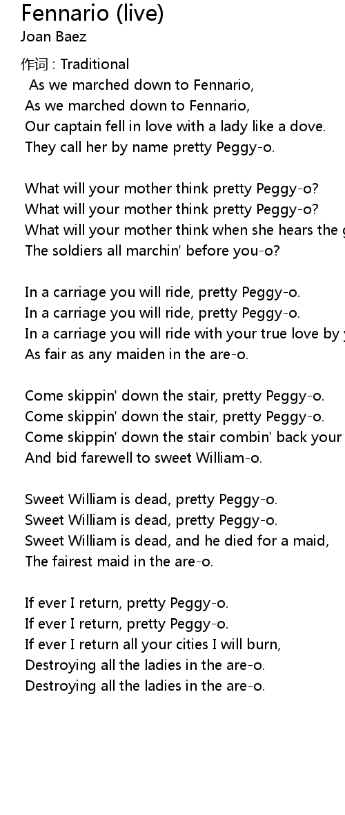 | Come skippin' down the stair, pretty Peggy-o. | |