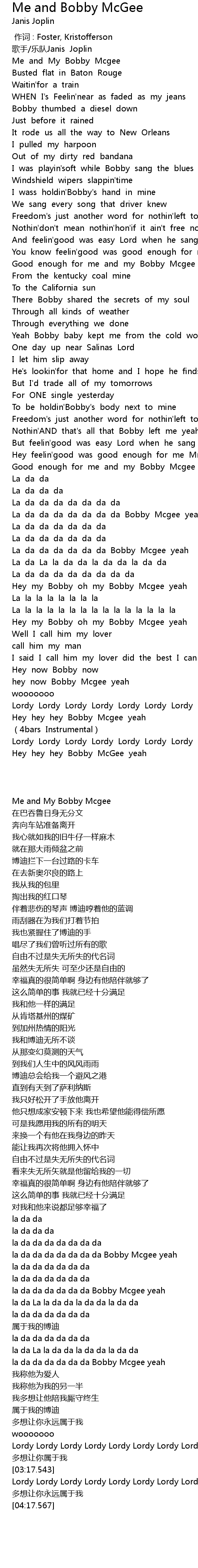 | [02:51.513] | Hey my Bobby oh my Bobby Mcgee yeah |