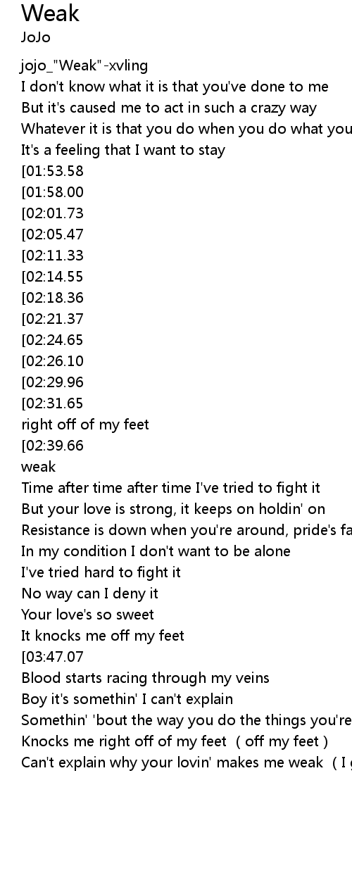 | [01:15.95][02:39.66][03:33.43][04:41.56] | Can't explain why your lovin' makes me weak |