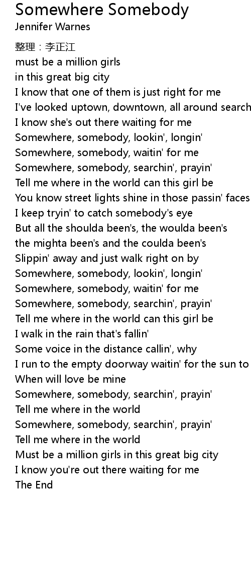 | [01:14.04] | Somewhere, somebody, waitin' for me |