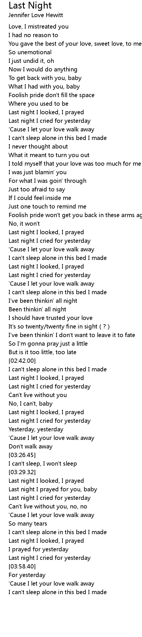 | [02:15.20] | I can' t sleep alone in this bed I made |