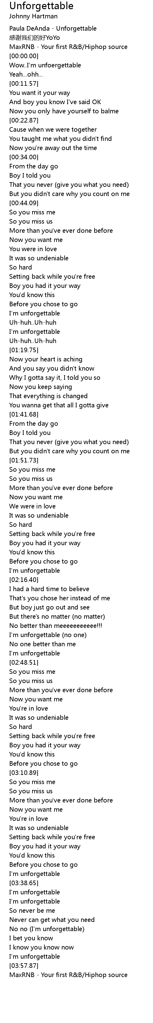 | [00:02.74] | Wow.. I' m unfoergettable |
