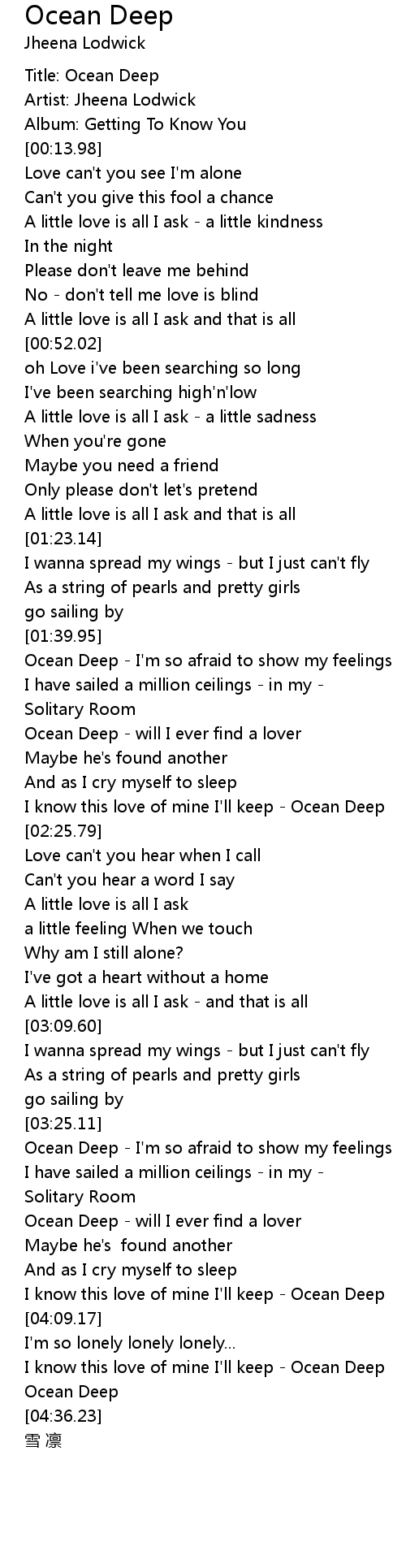 | [01:55.89] | Ocean Deep - will I ever find a lover |