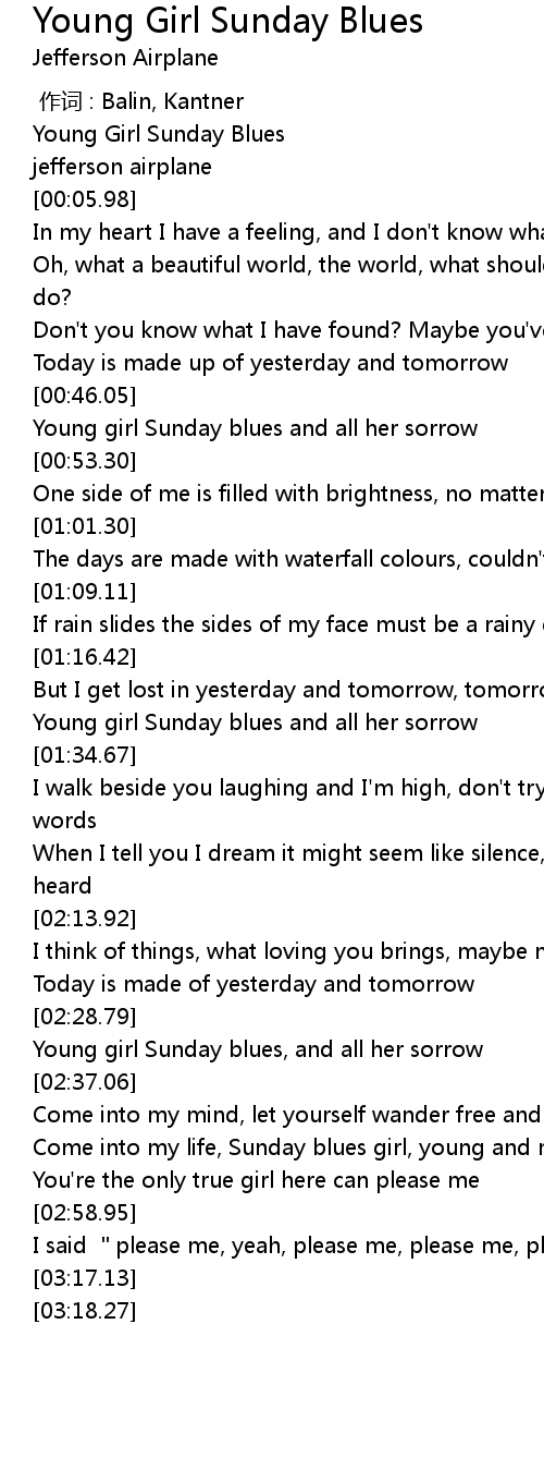 | [01:25.42] | Young girl Sunday blues and all her sorrow |