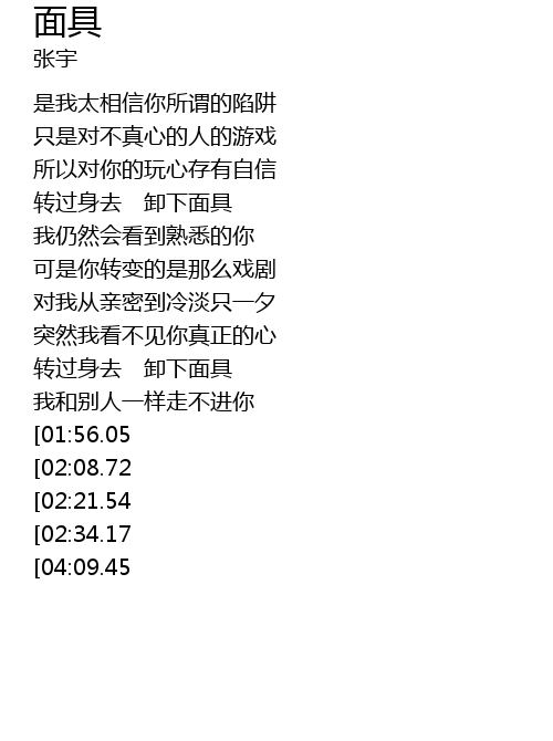 | [03:18.81][01:56.05] | 寂寞 骄傲 冷静 什么是面具后的表情 |