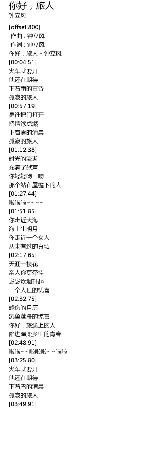 | [00:00.61] | 你好,旅人 - 钟立风 |