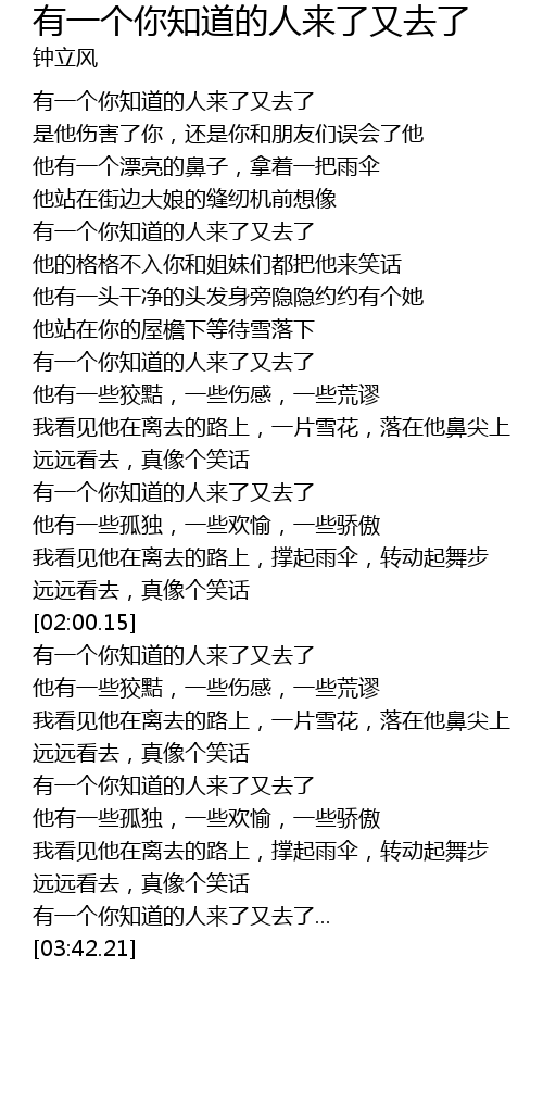 | [02:57.74] | 有一个你知道的人来了又去了 |