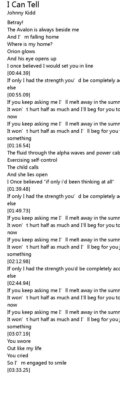 | [01:12.28] | It won' t hurt half as much and I' ll beg for you to just tell me something |