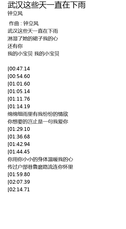 | [03:39.55][01:44.45] | wǔ hàn zhèi xiē tiān yī zhí zài xià yǔ |