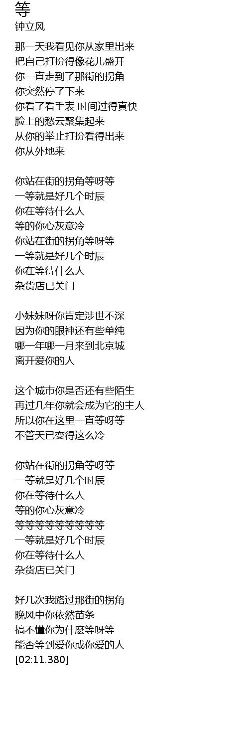 | [00:34.700] | 你站在街的拐角等呀等 |