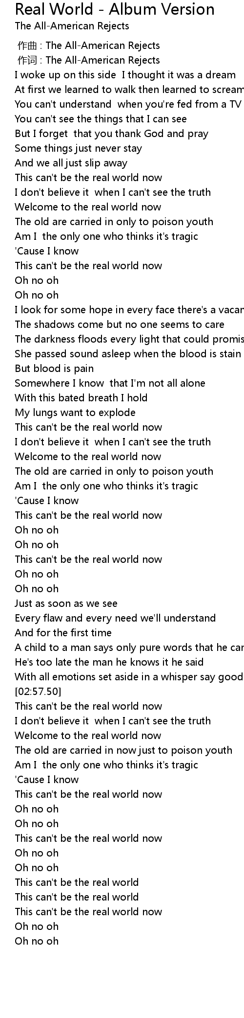 | [03:01.62] | This can' t be the real world now |