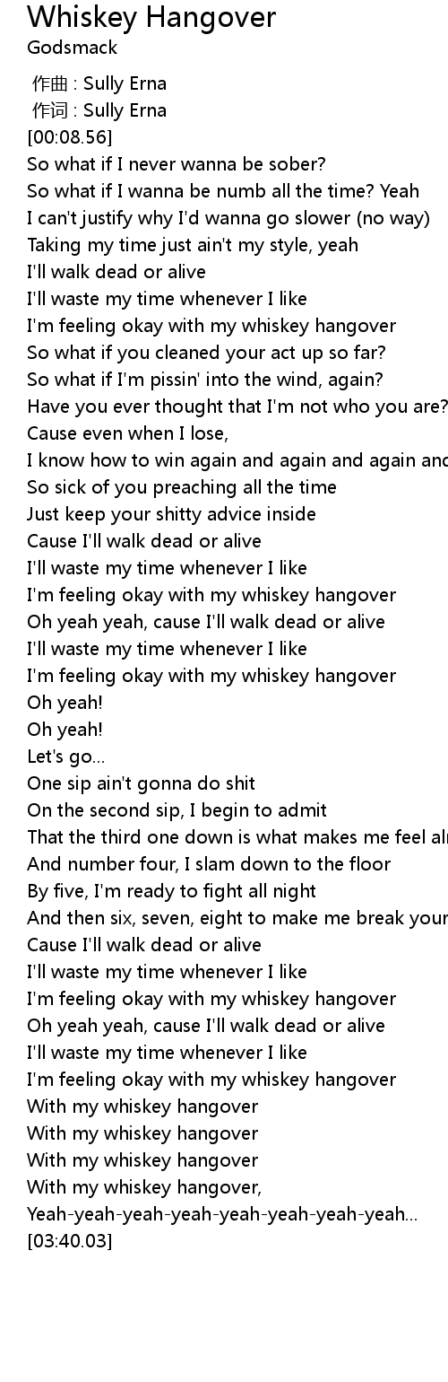 | [00:50.61] | I' m feeling okay with my whiskey hangover |
