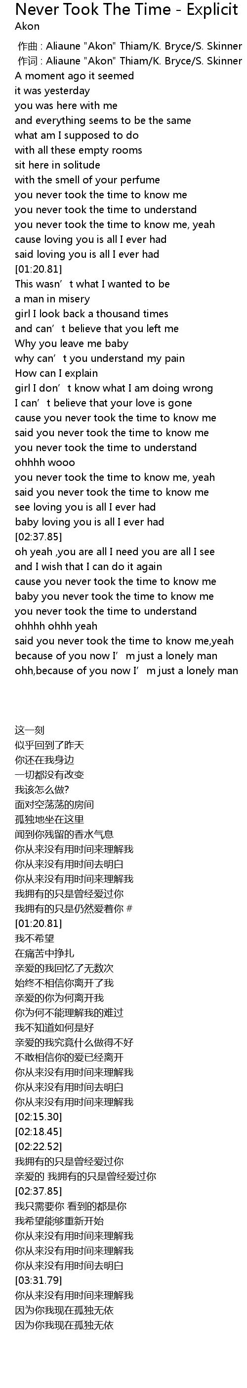 | [00:01.000] | 作词 : Aliaune "Akon" Thiam/K. Bryce/S. Skinner |