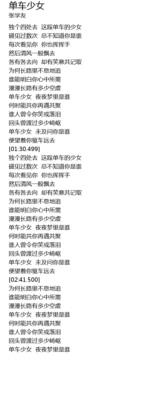 | [03:01.500] | 单车少女 夜夜梦里是谁 |