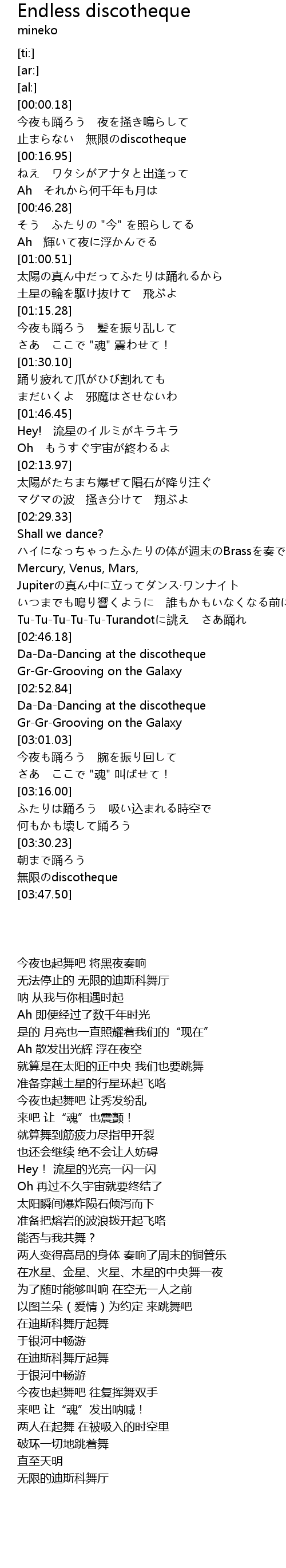 | [00:08.48] | 止まらない 無限のdiscotheque |