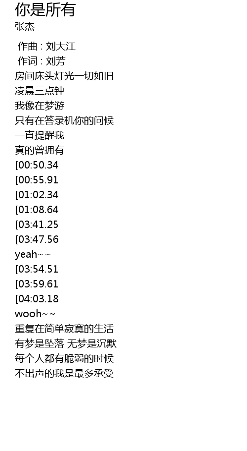 | [04:06.79][03:41.25][02:46.14][01:14.48] | 我说 baby你是我的所有 |