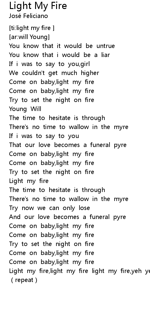 | [02:44.117] | Light my fire, light my fire light my fire, yeh yeh |