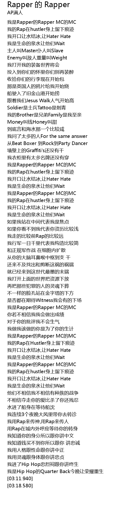 | [01:11.020] | wo shi Rapper de Rapper MC de MC |