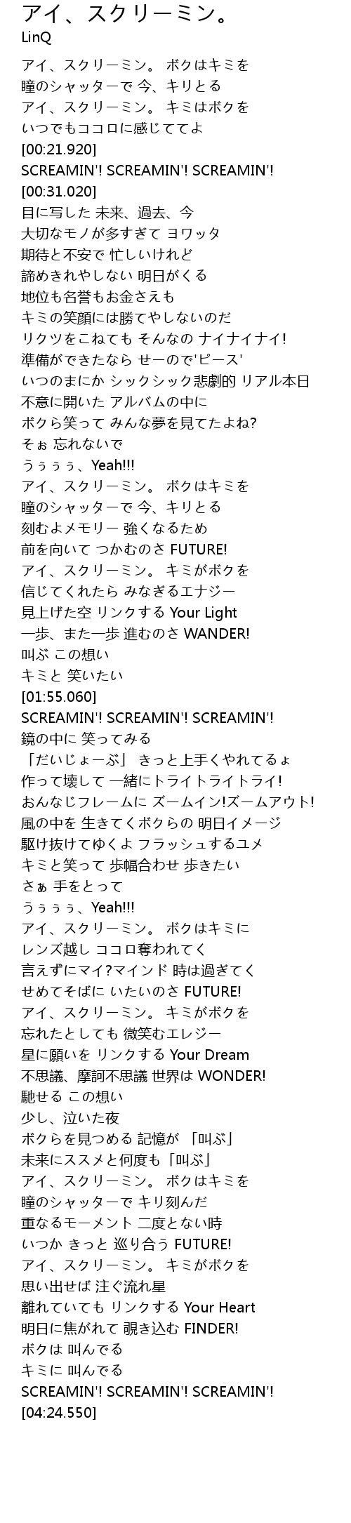 | [03:57.100] | アイ、スクリーミン。 キミがボクを |