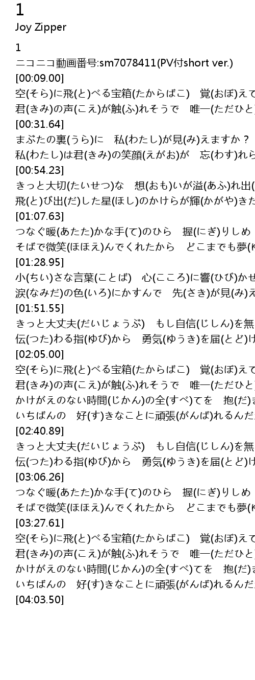 | [00:11.01] | 空(そら)に飛(と)べる宝箱(たからばこ) 覚(おぼ)えてる 在(あ)り処(か)を目指(めざ)して |
