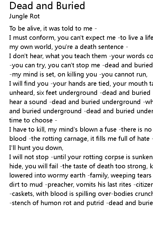 I will find you -your hands are tied, your mouth taped shut -the screams unheard, six feet underground -dead and buried underground -try to scream, won't hear a sound -dead and buried underground -what's left of you a dirt mount -dead and buried underground -dead and buried underground -so many victims, so little time to choose - |