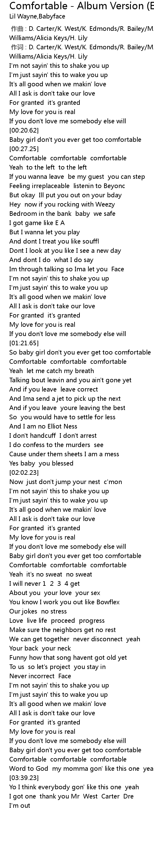 [00:01.000] 作词 : D. Carter/K. West/K. Edmonds/R. Bailey/M. Kent/Kenneth Williams/Alicia Keys/H. Lily