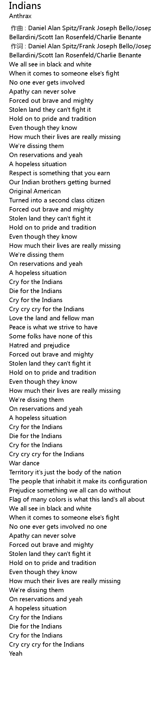 | [00:01.000] | 作词 : Daniel Alan Spitz/Frank Joseph Bello/Joseph Bellardini/Scott Ian Rosenfeld/Charlie Benante |