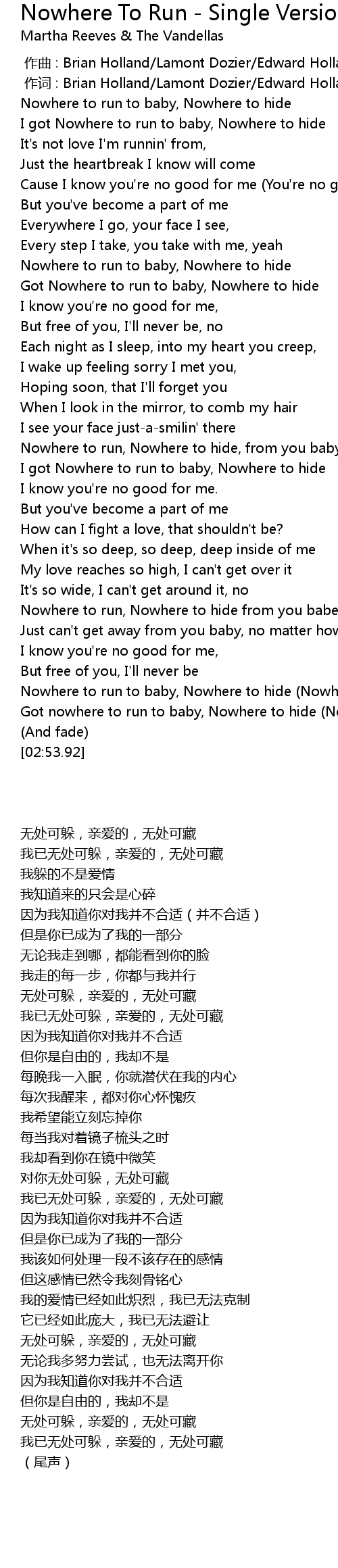 | [02:41.70] | Got nowhere to run to baby, Nowhere to hide Nowhere to hide |