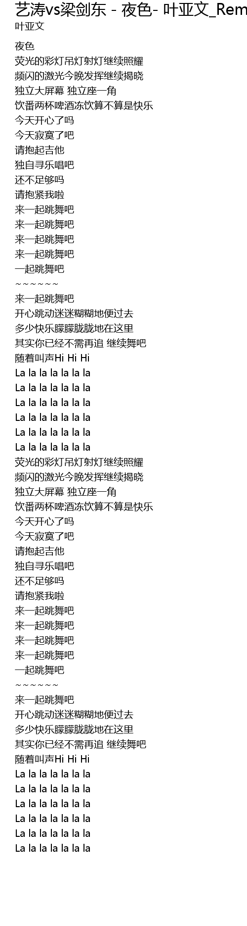 | Song | 艺涛vs梁剑东 - 夜色- 叶亚文_Remix |