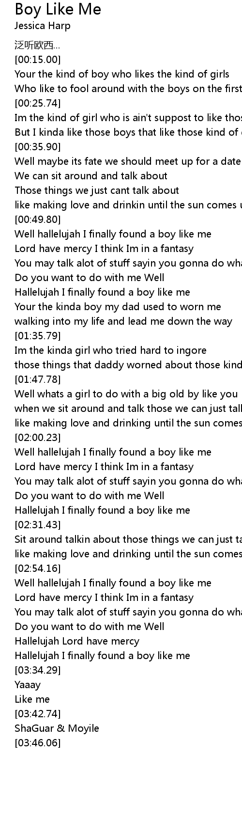| [02:00.82] | Well hallelujah I finally found a boy like me |