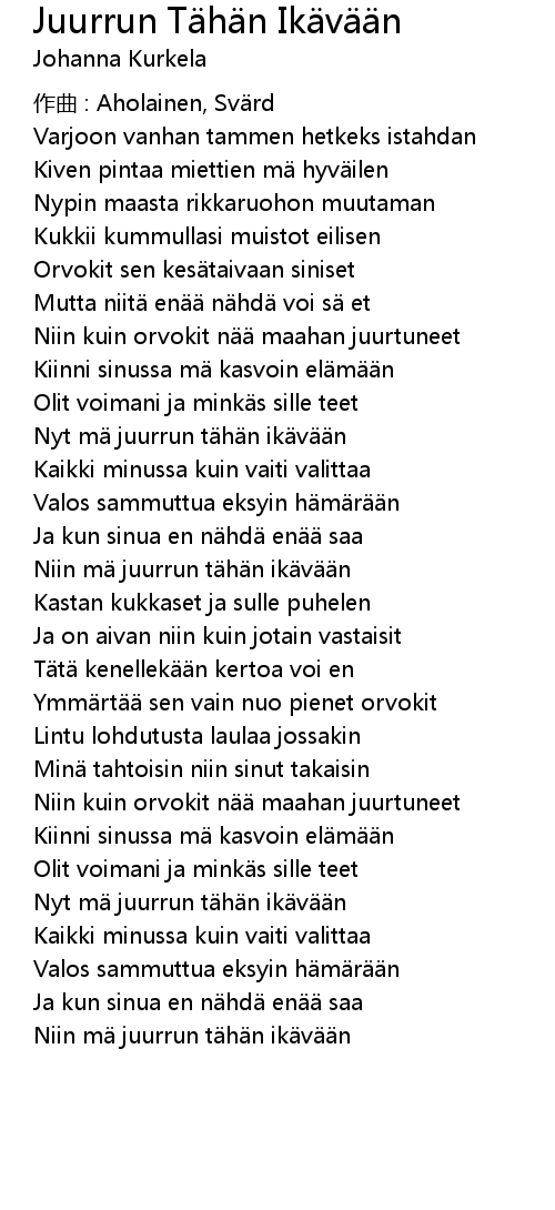 | Nyt mä juurrun tähän ikävään | |