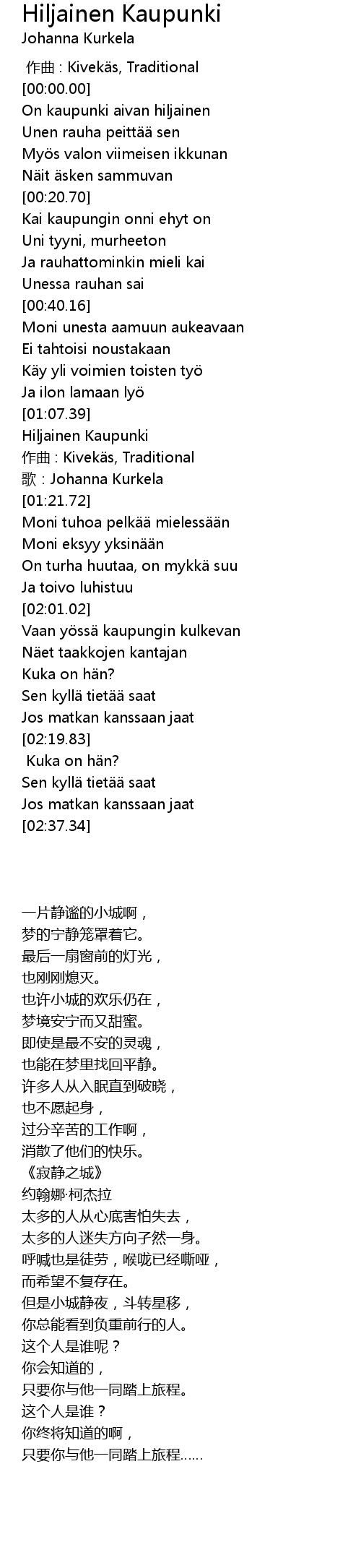 | [00:02.79] | On kaupunki aivan hiljainen |