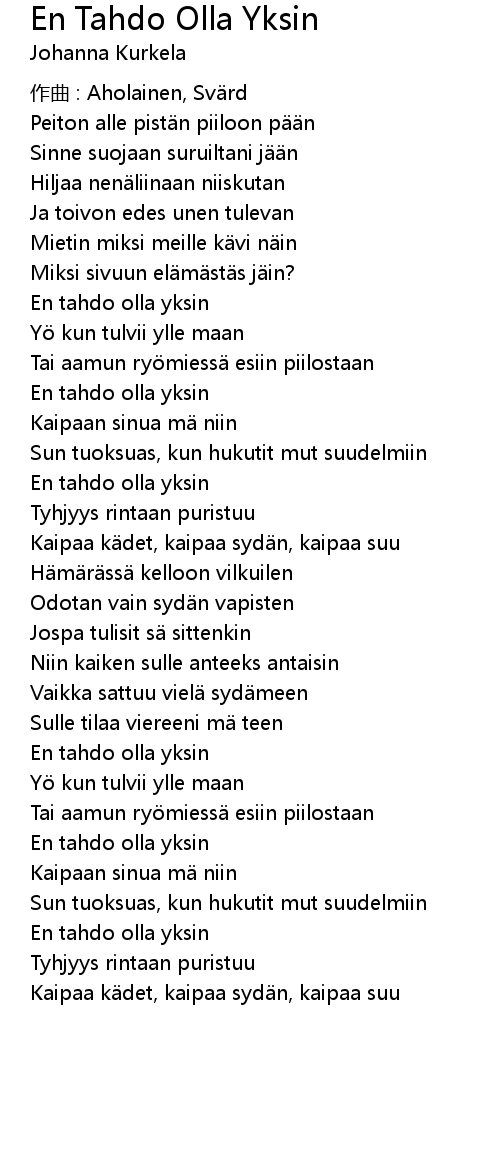 | Song | En Tahdo Olla Yksin |