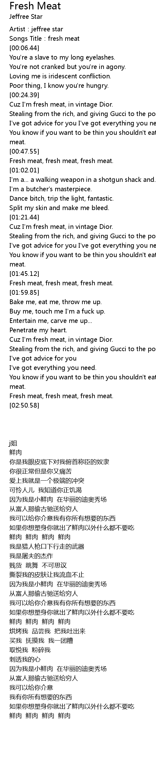 | [00:50.60] | Fresh meat, fresh meat, fresh meat. |