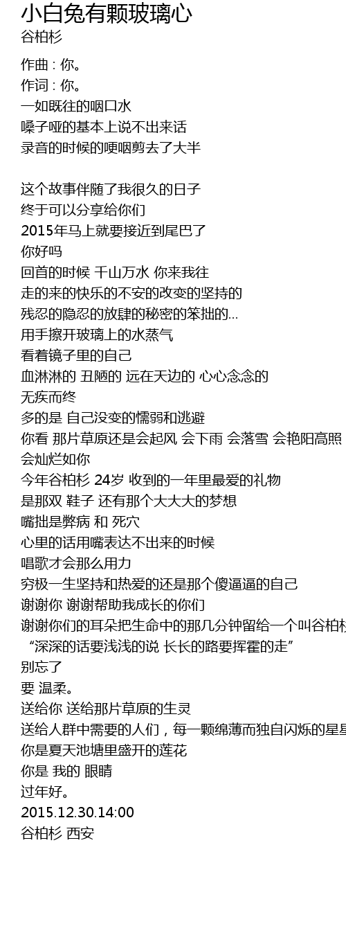 | 谢谢你 谢谢帮助我成长的你们 谢谢你们的耳朵把生命中的那几分钟留给一个叫谷柏杉的人 | |