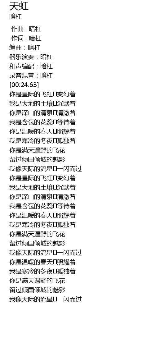 | [00:25.63] | 你是星际的飞虹 变幻着 |