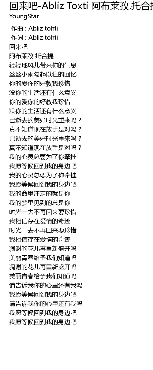 | Song | 回来吧-Abliz Toxti 阿布莱孜.托合提 |